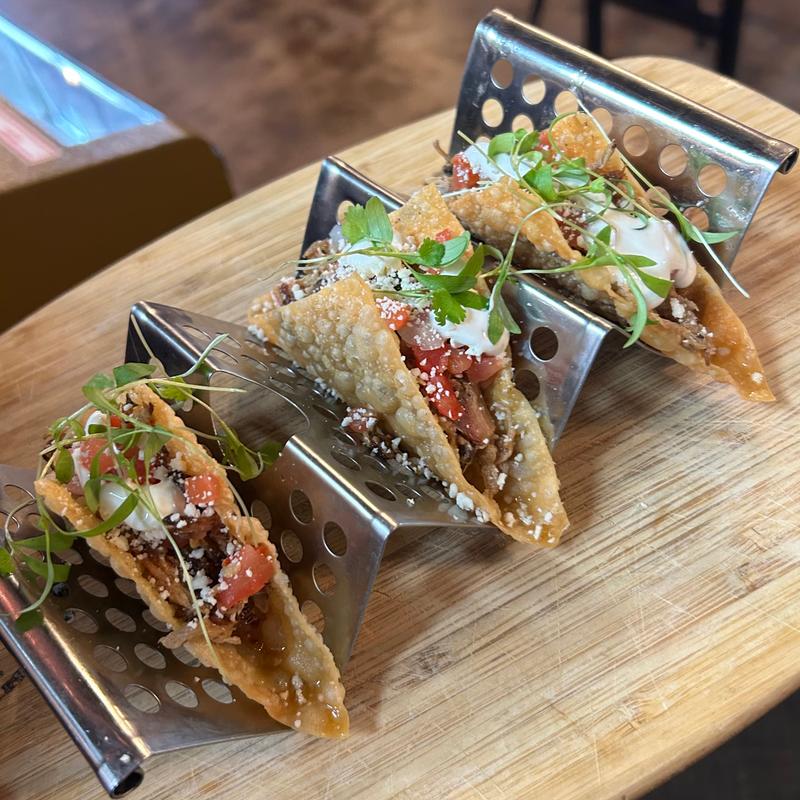 Light, crispy wonton wrappers filled with shredded pulled pork, pico de gallo, cotija cheese and micro cilantro topped with lime sour cream.